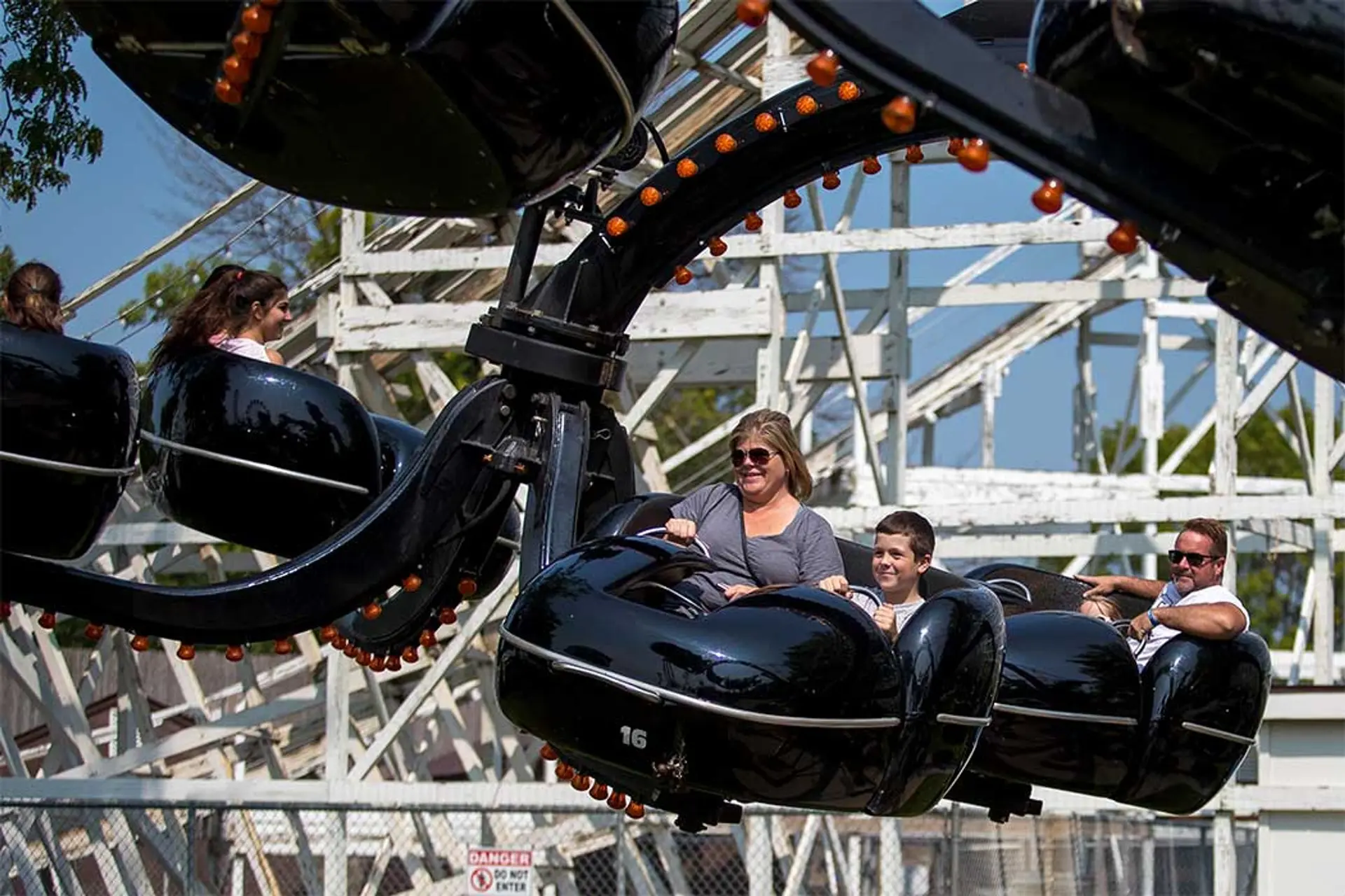 There have been countless legends about bad-intentioned, many-tentacled creatures roaming the depths, but none have ever made it onto land. Until now. Monster takes riders into its grips and spins, turns, lifts and drops them all at once on this family-friendly ride. The 24 twirling cars extend from six tentacles which rotate in a counter-clockwise motion on this monstrous ride. You won’t know which way is up as you get spun by the Monster’s tentacles in three different directions at once.